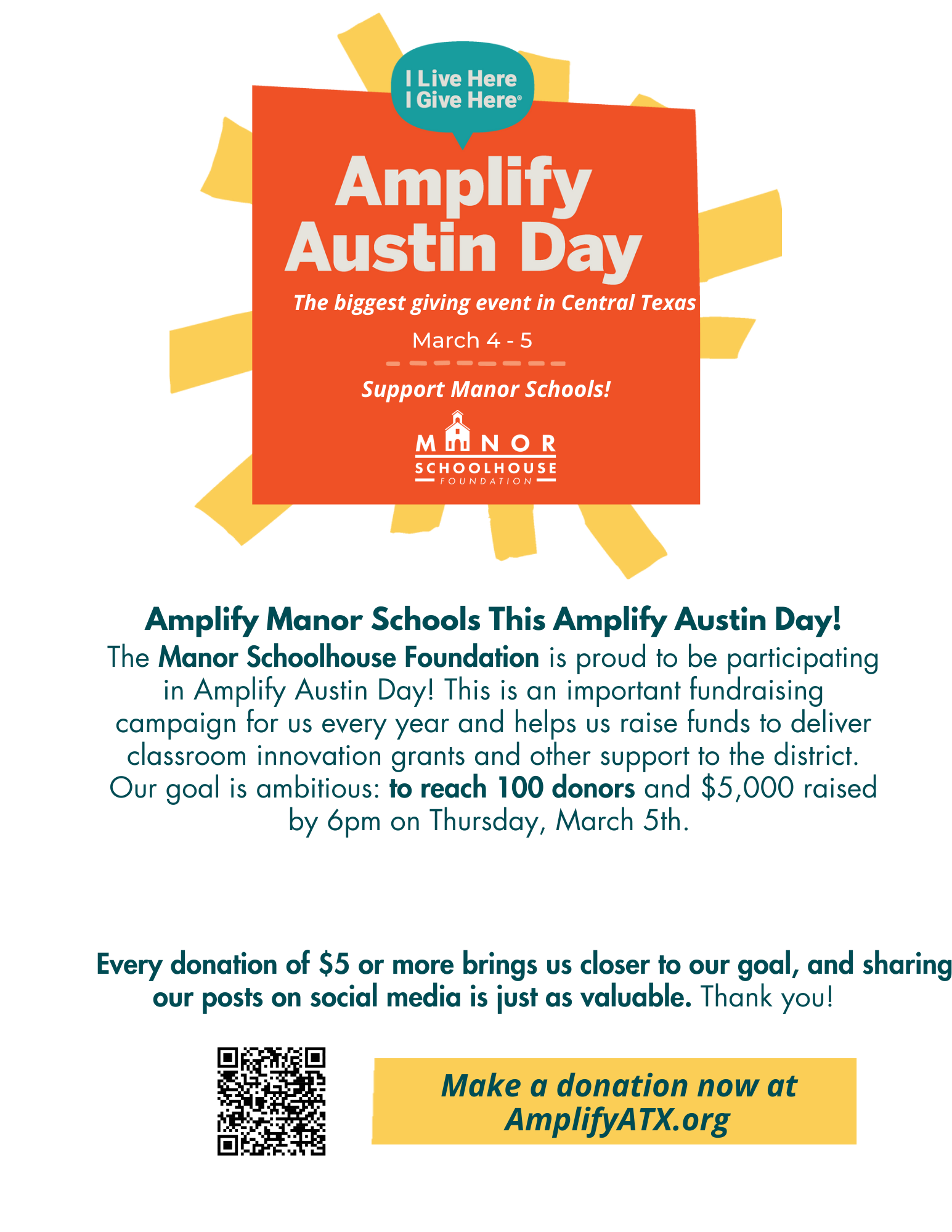 Manor ISD currently serves more than 9,000 students and is expected to grow significantly in the next 10 years. With state funding for public education continuing to shrink, the Schoolhouse Foundation’s purpose is to benefit teachers and students in the district by providing funds for educational programs and activities not covered by the district’s operating budget.